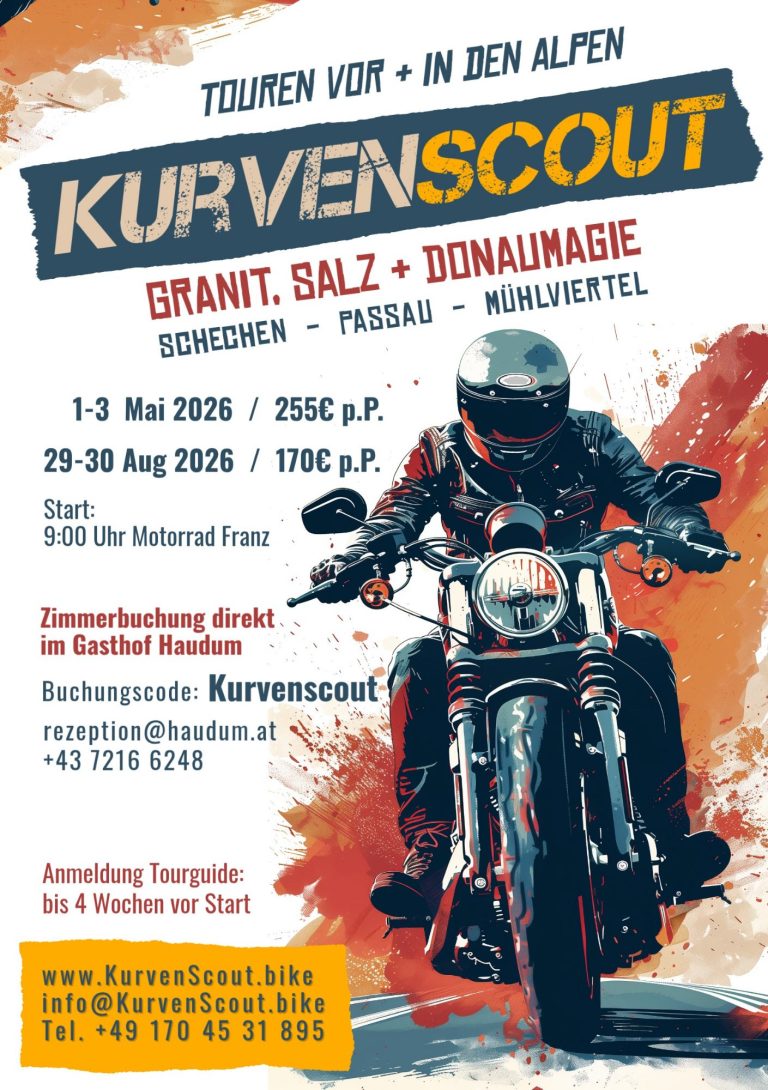 Diese 2‑(3)-Tagestour startet in Schechen beim Motorrad Franz und führt über kurvenreiche Nebenstraßen durch den Rupertiwinkel und das Innviertel bis tief ins Mühlviertel nach Oberösterreich. Abseits der Hauptstraßen erwarten dich unzählige Kurvenprofile, eindrucksvolle Landschaften und echte Highlights: der Panorama‑Blick auf die Dreiflüssestadt Passau, die berühmte Schlögener Schlinge und die mystischen Blutschalen am Heidenstein. Eine Tour wie gemacht für ambitionierte Kurvenfahrer, die Genuss und Fahrdynamik verbinden wollen.